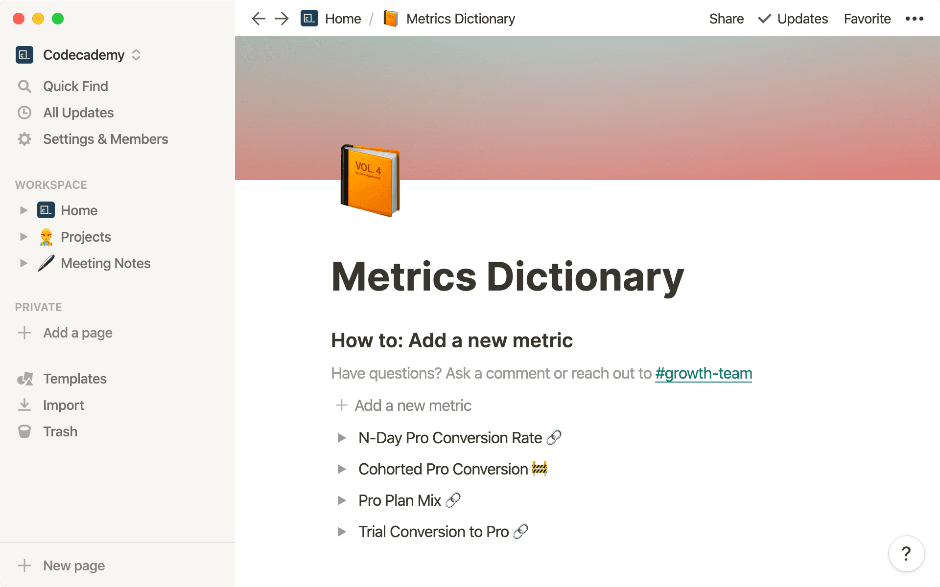 Codecademy’s data science team helps the entire company understand what’s working and what’s not. But with valuable knowledge stuck in the data science team’s heads, it was hard to provide guidance on how to best measure their goals across the company. Now the team maintains a wiki in Notion, including a Metric Dictionary, which organizes and defines all company KPIs.