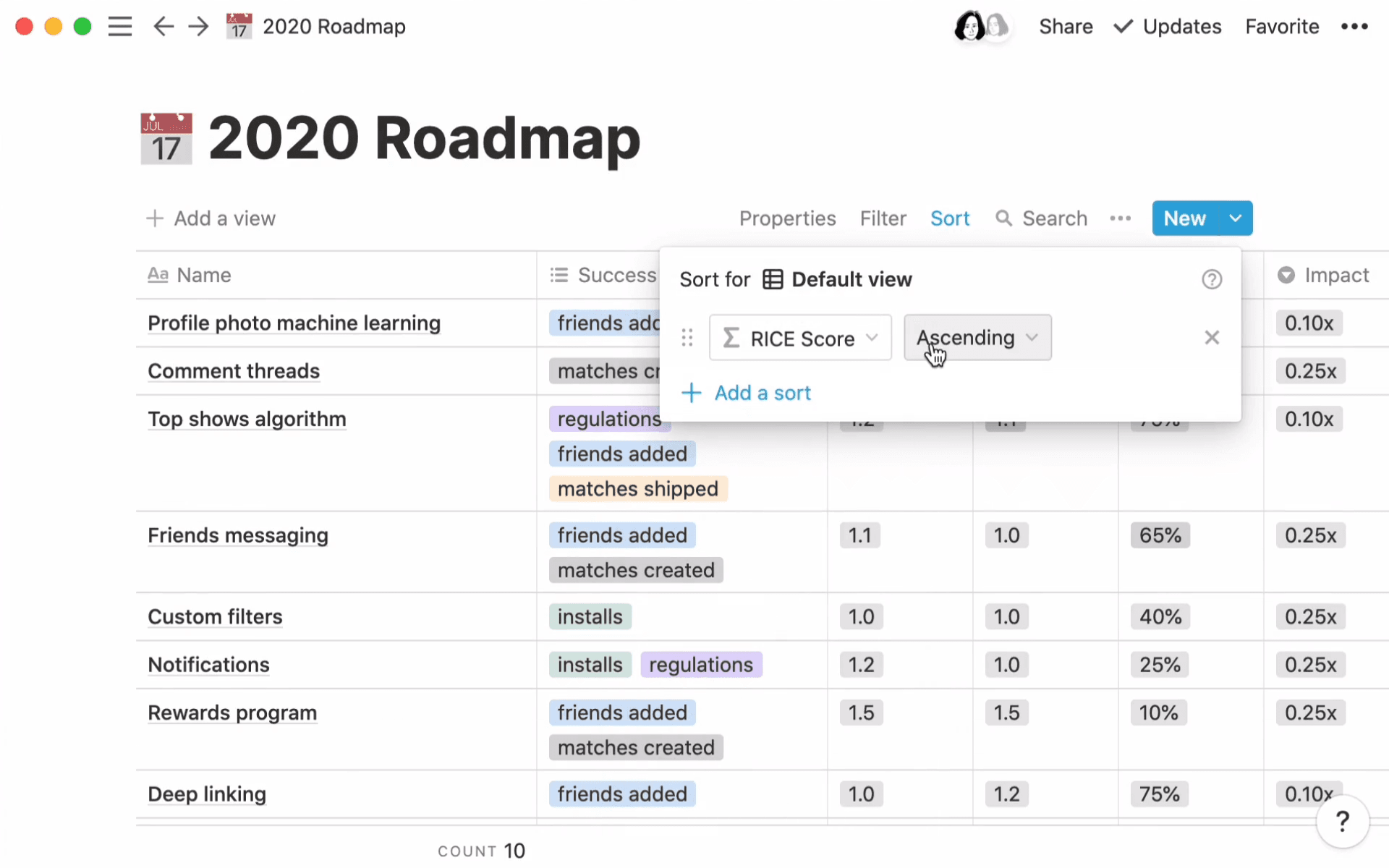 Les bonnes idées ne manquent pas chez +1 Labs, et il est parfois difficile de décider où investir et quels nouveaux produits concevoir en priorité. Avec Notion, l’équipe a pu créer rapidement la feuille de route de ses grands projets de l’année. Non seulement cela facilite la documentation et le suivi des projets, mais c’est aussi un outil de priorisation pour +1 Labs, qui utilise la fonctionnalité « formule » de Notion pour filtrer automatiquement chaque idée à l’aide d’un système de notation RICE. Ce système permet de déterminer clairement quels objectifs l’équipe doit poursuivre et quand, ce qui favorise la concentration de tout le monde, et rend la vision globale limpide.